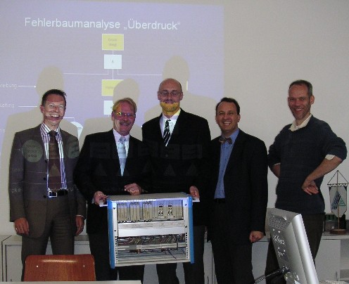 Projekt: Anlagensicherheit mit Mitteln der Prozessleittechnik nach den IEC-Normen Das Projekt entstand in einer ersten Diplomarbeit von Herrn Dipl.-Ing. Fecke mit freundlicher Unterstützung der Herren Richter (Yokogawa) sowie Pross und Hafner (HIMA) im Institut für Automatisierungstechnik an der Fachhochschule Köln. Die beteiligten im Projekt (von links nach rechts): Dipl.-Ing. H. Pross; HIMA, H. Richter, Yokogawa; Dipl.-Ing. Ch. Fecke; Prof. Große; Prof. Bold Herr Fecke erhielt den diesjährigen Förderpreis des VDI Köln aus den Händen des Vorsitzendern, Herrn Dipl.-Ing. Firsbach, wozu das Institut herzlich gratuliert: Ziel dieses Projekts ist es, die wesentlichen Inhalte der Anlagensicherheit vorzustellen, die für einen PLT-Ingenieur bei der Planung und Errichtung von Schutzeinrichtungen einer Prozessanlage von grundlegender Bedeutung sind. Der Schwerpunkt liegt bei der Anwendung der DIN EN 61511 Teil 1-3 an einer Beispielanlage aus der Prozessindustrie. Weitere Relevanz haben die Störfallverordnung, die Verordnung über brennbare Flüssigkeiten, die Bundesimmissionsschutzverordnung, sowie das Wasserhaushaltsgesetz (WHG) im Bezug auf Überfüllsicherungen und die wesentlichen Inhalte der Explosionsschutzrichtlinie ATEX 100a. Diese Kenntnisse sind für den PLT-Sicherheitsingenieur bei der Auswahl von geeigneten Komponenten für Schutzeinrichtungen von besonderer Bedeutung. Zur Berechnung der Sicherheitsintegritätslevel (SIL) bzw. der Ausfallwahrscheinlichkeit der Schutzeinrichtungen wird das Tool „SILence“ verwendet. Die einzelnen Funktionen der Schutzeinrichtungen werden auf einer sicherheitsgerichteten Steuerung der Firma HIMA realisiert. Die zugehörige Programmierung wird mit dem Tool „ELOP“ vorgenommen. Die Werkzeuge und die Steuerung wurden dankenswerterweise von der Firma HIMA zur Verfügung gestellt. Die Norm DIN EN 61511 Teil 1-3 findet erst seit Februar 2004 Anwendung in der Prozessindustrie in Deutschland. Viele Unternehmen haben bei der Umsetzung große Schwierigkeiten und bevorzugen noch immer die alte Betrachtungsweise nach der auslaufenden Norm DIN V 19250 (Grundlegende Sicherheitsbetrachtungen für MSR-Schutzeinrichtungen). Zurzeit gibt es zu dem Inhalt der Norm noch sehr wenig Literatur auf den Markt. Die qualitative Methode des Risikographen zur Bestimmung der Sicherheitsintegritätslevel von Schutzeinrichtungen wird allerdings schon häufiger angewendet, da sie bereits in der DIN V 19250 in ähnlicher Art und Weise (Anforderungsklassen) angewendet wurde. Die quantitative Methode (Fehlerbaumanalyse / Ereignisablaufanalyse) ist jedoch bei ihrer Anwendung sehr aufwändig und verlangt deshalb dem PLT-Sicherheitsingenieur viel Fachwissen ab. Daher wird sie sich vermutlich nur sehr schwer und langsam in der Prozessindustrie durchsetzen. Die Berechnung der Sicherheitsintegritätslevel von Schutzeinrichtungen ist in der Regel mit den Bestimmungsgleichungen der DIN EN 61508 Teil 1-7 durchzuführen. Als Sonderfall gibt es allerdings die diversitäre Redundanz bei der Anordnung von Sicherheitseinrichtungen, für den die gängigen Bestimmungsgleichungen der Norm DIN EN 61511 neu hergeleitet werden müssen. In dem Berechnungstool „SILence“ der Firma HIMA ist dieser Sonderfall bereits implementiert. In absehbarer Zukunft werden die Berechnungstools immer leistungsstärker und können somit immer mehr Problemstellungen lösen. Leider gibt es zum gegenwärtigen Zeitpunkt noch zu wenig Hersteller, die ihre Komponenten nach SIL zertifizieren lassen und die Ausfalldaten der Komponenten für Berechnungstools zur Verfügung stellen. Zum gegenwärtigen Zeitpunkt setzen noch zu wenige Unternehmen und Ingenieurbüros im Bereich der Anlagensicherheit die Sicherheitsnorm DIN EN 61511 um. Daher besteht für sie noch viel Nachholbedarf bei der Schulung ihrer Sicherheitsingenieure, damit es bei der Anwendung der Sicherheitsnorm bei der Erstellung von Produktionsanlagen bis zum August dieses Jahres keine Schwierigkeiten mehr gibt. |